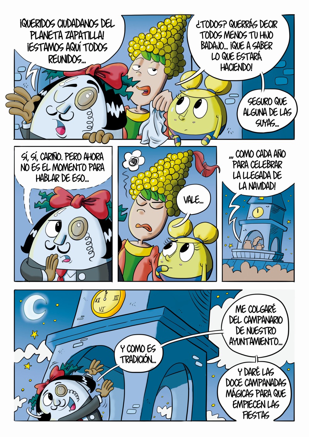 What would happen if Christmas Eve never ended? All the clocks on the planet Zapatilla stopped at 11:59 p.m. on Christmas Eve. Nobody knows why it happened, but everyone fears the worst. There will never be Christmas again! Unless, of course, a determined and eccentric group of brave souls manages to find the root of the problem and solve the situation.