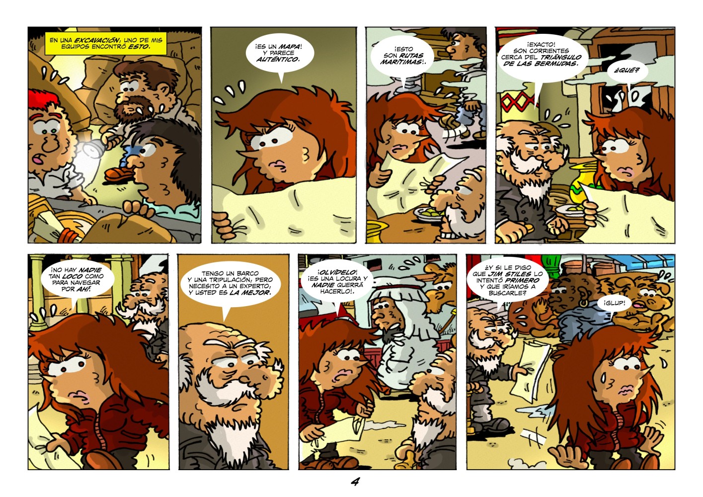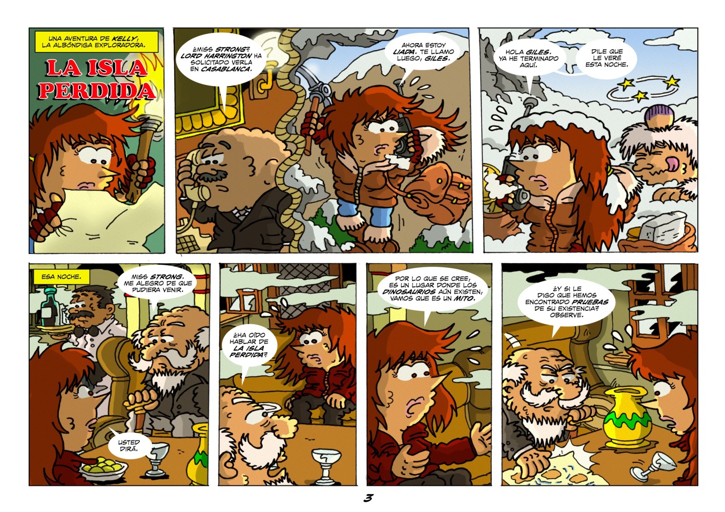 "Kelly Strong – La isla perdida" is an action-packed, humorous adventure comic for all ages. It tells the story of Kelly, the adventurous meatball from Meatball World, a treasure hunter who is one day contacted by Lord Harrington. He asks for her help on an expedition to find the lost island, a legendary place rumored to be home to dinosaurs. Although Kelly initially refuses, when Lord Harrington tells her that Jimmy Stiles, Kelly's childhood sweetheart, was the first to attempt to reach the island and hasn't been heard from since, Kelly has no choice but to join him in the search for the island and to rescue Jimmy.